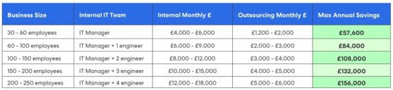 To illustrate potential savings, here is a cost comparison of maintaining an internal IT team vs outsourcing IT support services (based on industry averages vs our average support pricing):